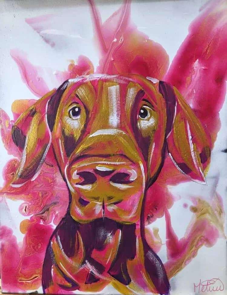 Symbiose embodies the harmonious connection between strength and gentleness. This portrait of a brown Labrador, set against an abstract pink and gold background, evokes timeless loyalty and serenity.