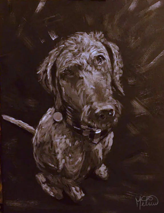 This monochromatic portrait captures the soulful gaze of a Labradoodle, embodying loyalty and unspoken affection. The subtle texture of the brushstrokes brings depth to its soft fur, while the dark background accentuates the dog's expressive eyes. This piece speaks to the unbreakable bond between humans and their furry companions, highlighting the quiet yet profound love that only a dog can offer.