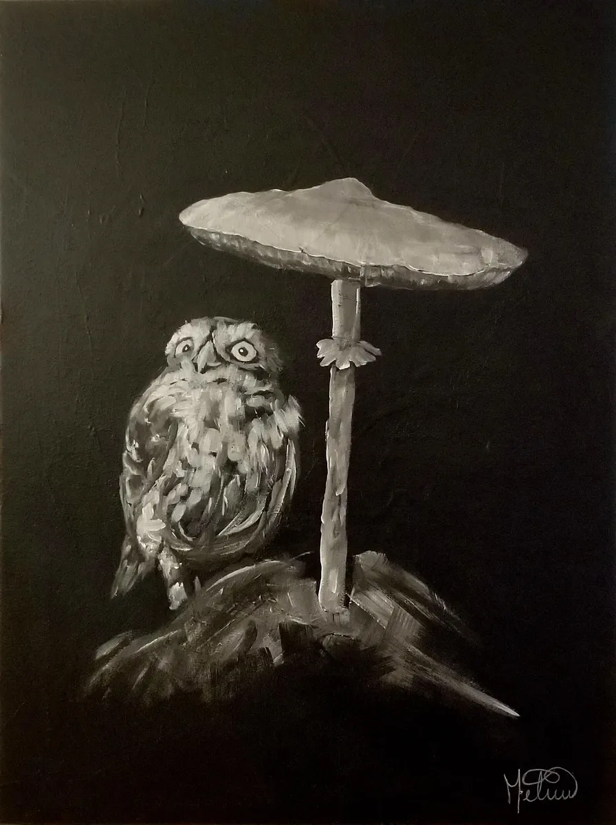 This monochrome piece captures a delicate moment of vulnerability and resilience. The small owl, perched under a giant mushroom, evokes a scene that is both fragile and poetic. The soft light brushing its feathers contrasts with the surrounding shadows, symbolizing both protection and introspection. This painting invites viewers to marvel at the quiet beauty of nature's details and find wonder in moments of stillness amidst a chaotic world.