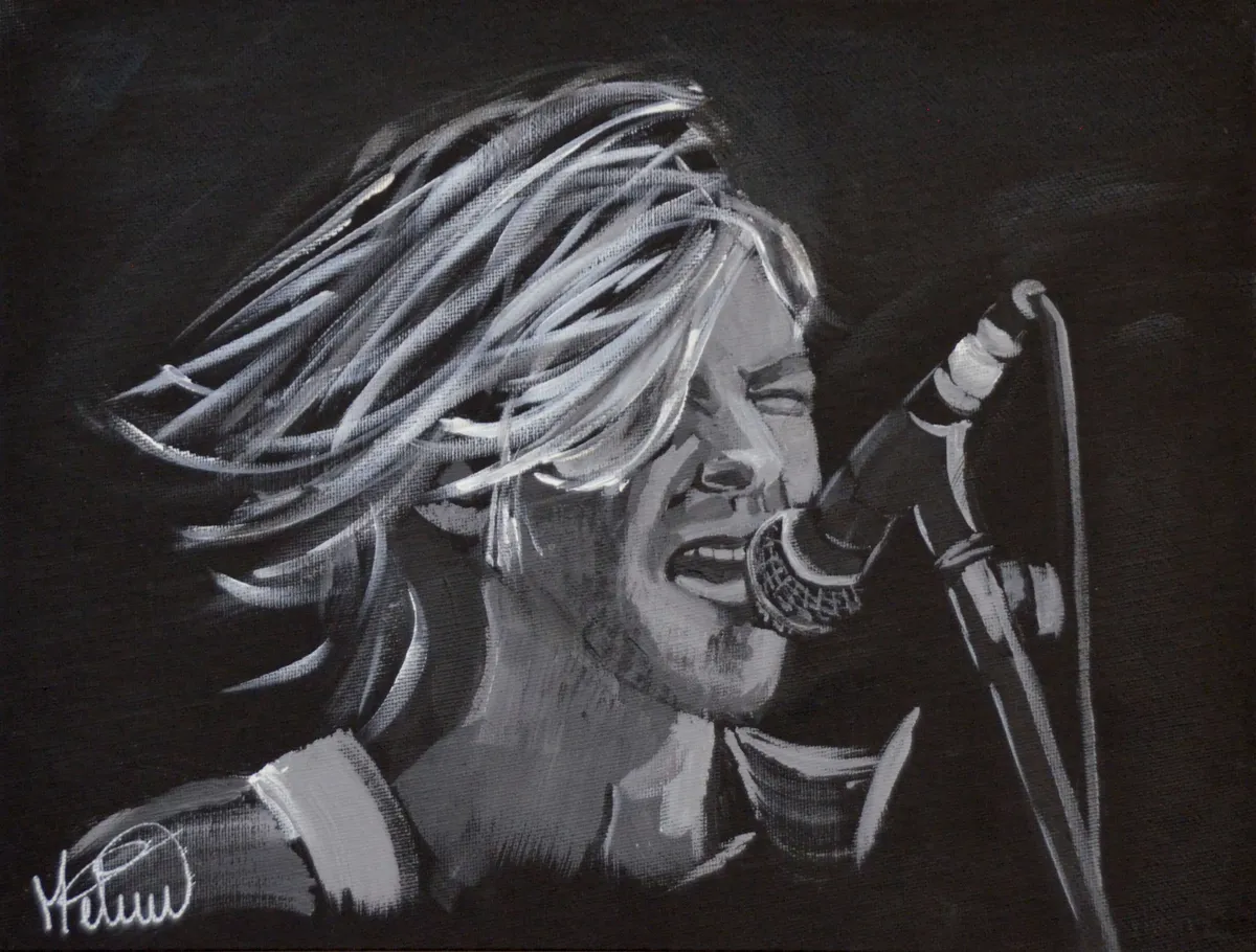 Grunge Vibe captures the intensity and vulnerability of Kurt Cobain mid-performance. The monochrome tones and expressive details highlight the raw authenticity and emotional power that define this musical legend.