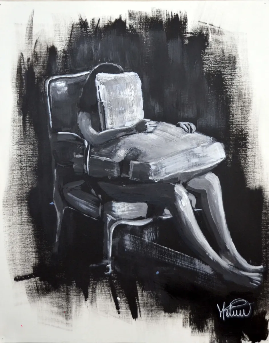 Disappeared delves into themes of erasure and absence through a striking monochromatic composition. The seated woman, hidden beneath chair cushions, embodies isolation and duality, revealed by bold contrasts and expressive texture