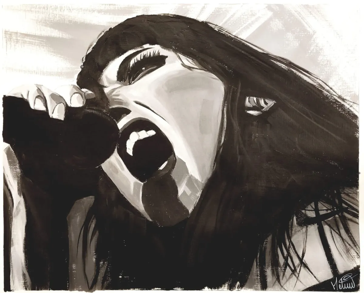 This painting captures Tatiana Shmayluk, Jinjer’s electrifying vocalist, in a moment of raw power and emotion. Her commanding pose and intense gaze embody the passion and energy she brings to every performance. The monochromatic palette amplifies the strength of her presence, celebrating her unique ability to merge ferocity with deep emotion.