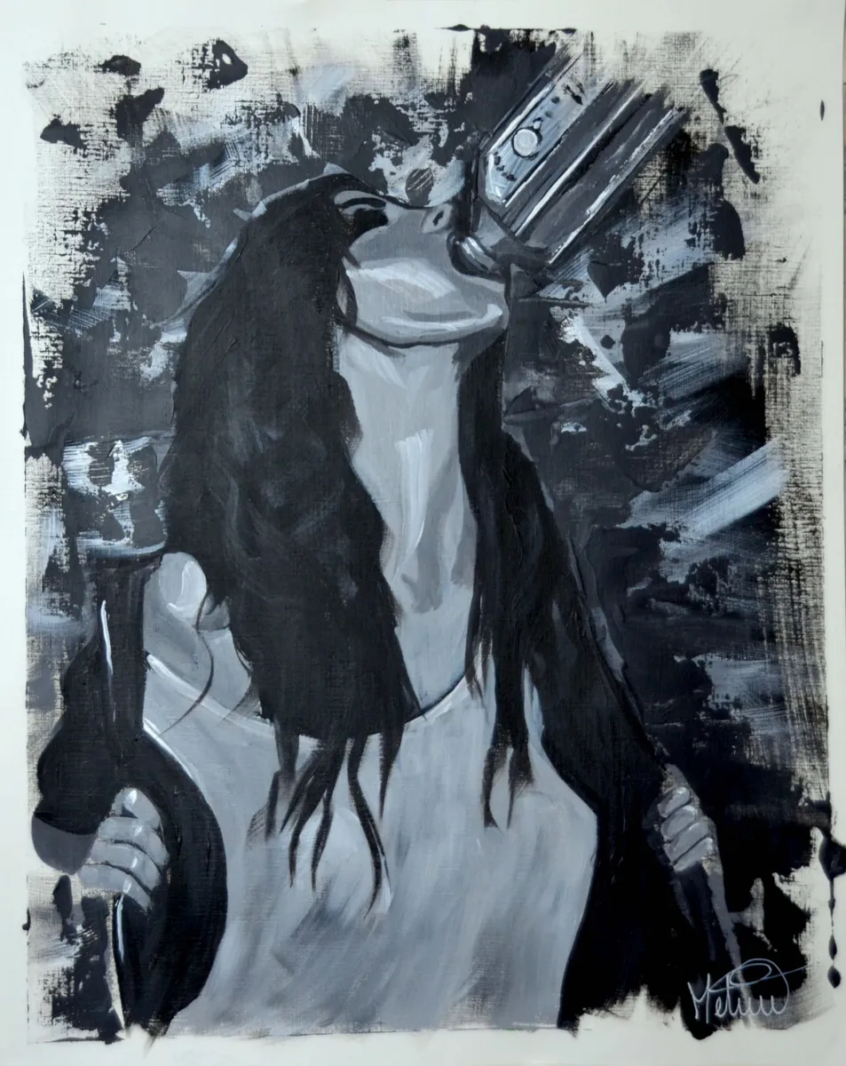 Disappeared delves into themes of erasure and absence through a striking monochromatic composition. The seated woman, hidden beneath chair cushions, embodies isolation and duality, revealed by bold contrasts and expressive texture