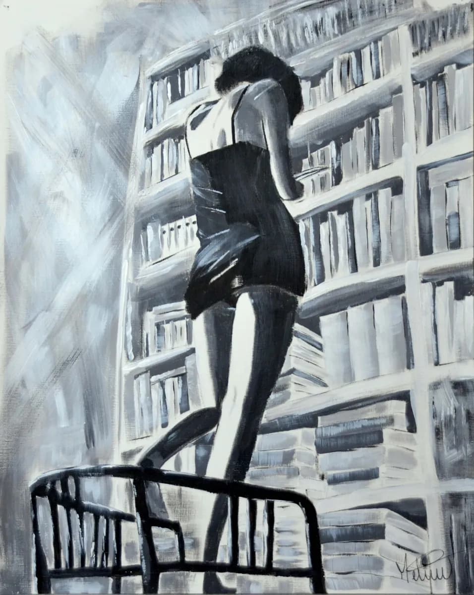 Just a Last Page portrays a woman balancing on a chair in a suspended moment as she reaches for a book on a shelf. This monochromatic scene, filled with fragility and introspection, evokes the timeless pursuit of knowledge and the yearning for escape through the pages of a book.
