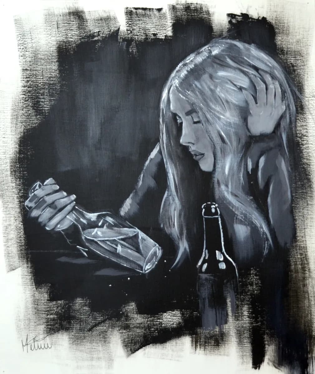 Again depicts a poignant moment of introspection and inner struggle. Through its striking black-and-white contrast, the artwork intensely explores themes of addiction, doubt, and resilience, conveyed through a posture both fragile and weighty.